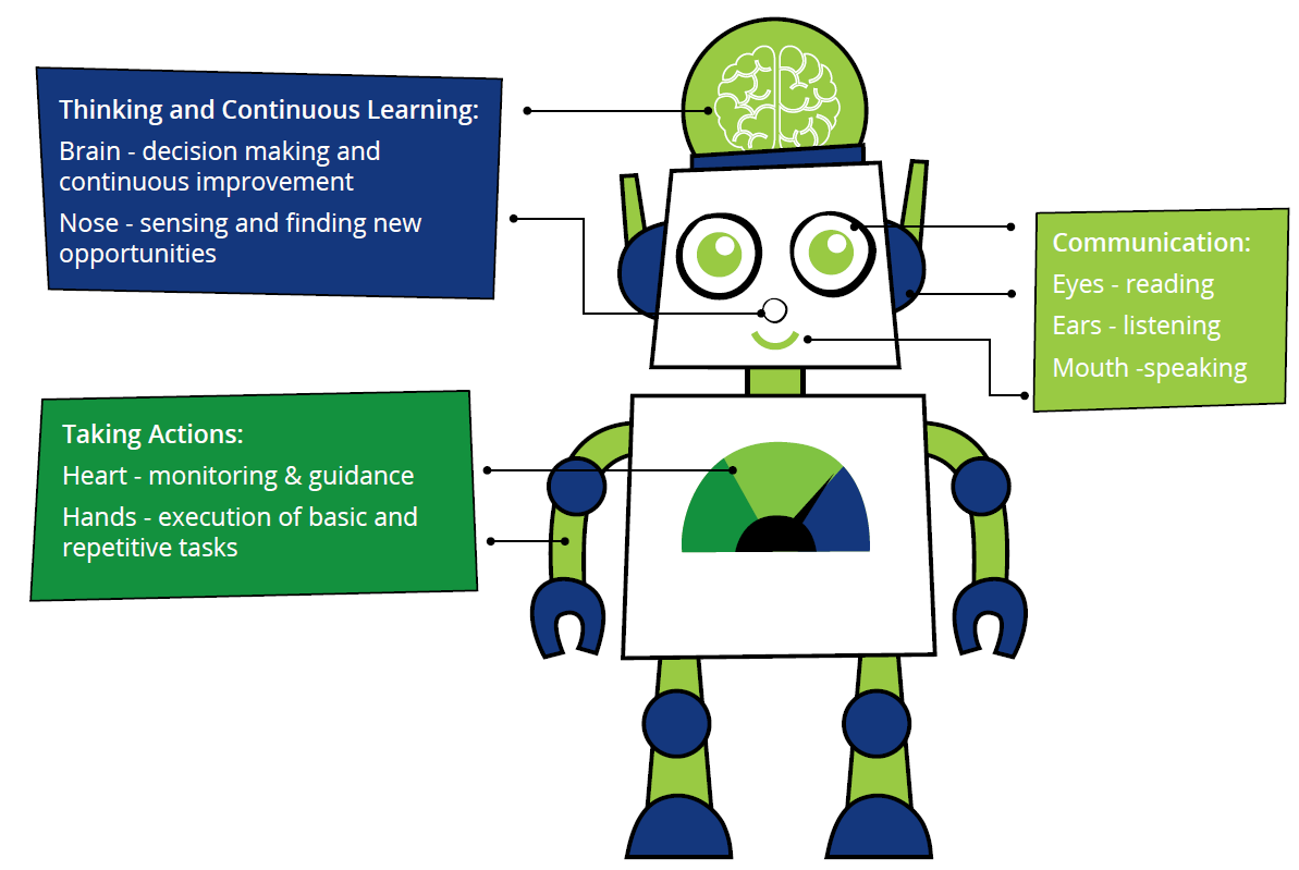 현재까지는 RPA가 자동화를 대표하는 용어이자 마케팅 문구라고 할 수 있으나, 궁극적으로 자동화는 인간처럼 생각하고, 듣고 말할 수 있으며, 행동하는 것을 의미한다. 마치 공장의 로봇처럼 말이다. RPA 처럼 인간을 대신해서 PC에서 네이버 접속하고, 엑셀에 데이터 기록하고, DB에 저장하는 인간의 행위를 자동화하는 것은 현재 보편적인 디지털 기술이다. 이를 좀더 고도화해서 인간처럼 보고, 듣고, 말하는 것을 자동화하기 위해 OCR, 자연어 처리, ChatBot 등의 디지털 기술이 속속들이 소개되고 있다. 그리고 인간의 머리에 해당하는 지능은 AI와 머신러닝을 통해 가능해질 것이다. 결국, 이 모든 것이 결합되어 인간처럼 능동적이고 의사결정이 가능한 디지털 기반을 만드는 것이 자동화의 미래가 될 것이다.
