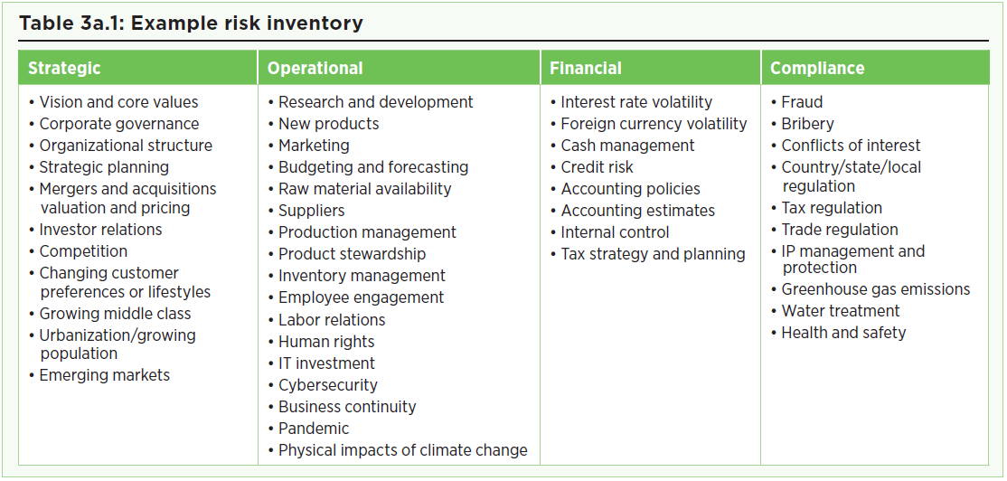 전통적으로 ERM에서 다루는 리스크는 Strategic Risk, Operational Risk, Financial Risk, Compliance Risk로 구분되며, 이는 조직의 value chain에 매핑되어 업무 프로세스 수행 중에 관리해야 하는 중점관리 대상 리스크로서 자리매김된다. Strategic Risk는 조직의 전략과 기획 측면에서 관리해야 하는 리스크로, 특정 기능조직에서 관리한다기 보다는 전사 관점에서 경영진 agenda로서 관리해야 하는 리스크이다. Operational Risk은 업무를 수행하는 기능조직에서 관리해야 하는 운영 상의 리스크로서, 구매조달/생산/물류/영업/판매 등의 primary activities와 IT/HR/R&D 등의 secondary activities에서 발생 가능한 리스크를 정의한다. Financial Risk는 말 그대로 재무 리스크이고, Compliance Risk는 내외부 법률/규제/규정의 준수를 의미하는 준법 리스크이다.