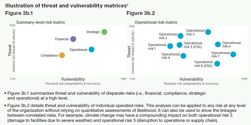 그렇다면, 식별된 리스크를 어떻게 평가하는가? 통상적인 ERM 체계 하에서는 고유 리스크(Inherent Risk)를 영향도(Impact) x 발생빈도(Likelihood)로 평가하고, 잔여 리스크(Residual Risk)를 vulnerability로 평가한다. ESG 관련 리스크도 이와 유사한 기준으로 평가가 가능하겠으나, COSO에서는 고유 리스크는 영향도(Impact)와 개별 리스크가 조직에 영향을 미치는 속도(velocity)로 평가하고, 잔여 리스크는 리스크 대응 위한 적응성(adaptability)과 회복력(recovery)로 평가하도록 권고한다. ERM과 ESG가 각자의 평가 기준으로 평가되어 고유 리스크와 잔여 리스크가 평가되면, 아래와 같은 matrix에서 통합적으로 우선순위화 가능해진다.